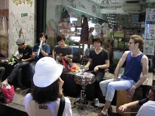 Party at night around, see this weird band